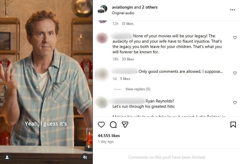 Fans Slam Reynolds Over Aviation Gin Post (Kredit Foto: Aviationgin/Instagram)