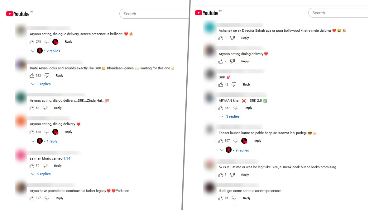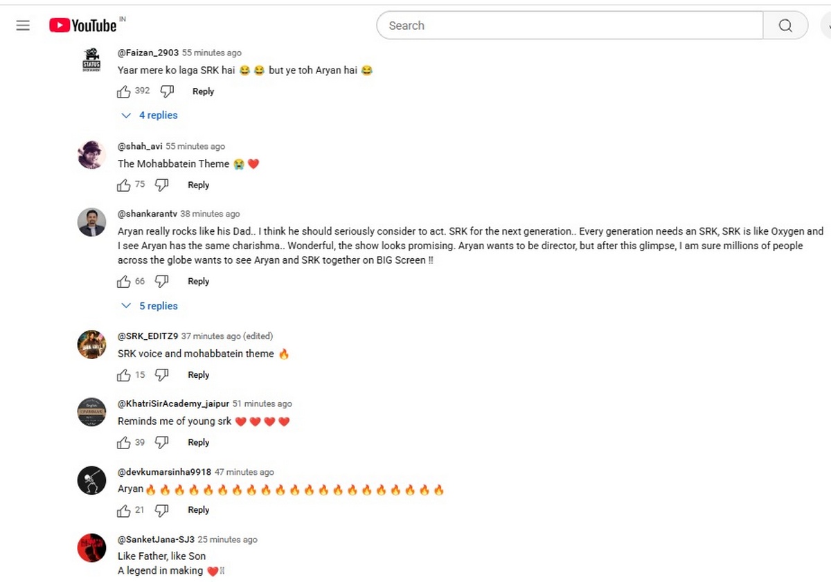 Di YouTube, seorang pengguna berkomentar, “Bung Arya terlihat dan terdengar persis seperti gen SRK💥 Khandaani 🙌🏻 menunggu yang ini”. Pemirsa lain berkata, “Akting Arya, pengiriman dialog, kehadiran layar brilian! ❤️🔥.” Satu lagi pengguna berkata, “Arya memiliki potensi untuk melanjutkan warisan ayahnya” SRK Son. ” Yang lain berkata, “Yaar Mere Ko Laga Srk Hai 😂😂 Tapi Kamu toh Arya dua 😂 ”. (Saya pikir itu SRK, tapi itu Arya.)” Mengingatkan saya pada SRK muda, “komentar pengguna lain, sementara satu mengamati,” Arya benar -benar bergoyang seperti ayahnya .. Saya pikir dia harus mempertimbangkan dengan serius untuk bertindak. SRK untuk generasi berikutnya .. Setiap generasi membutuhkan SRK, SRK seperti oksigen dan saya melihat Arya memiliki kasarnya yang sama .. Luar biasa, pertunjukan ini terlihat menjanjikan. Arya ingin menjadi sutradara, tetapi setelah sekilas ini, saya yakin jutaan orang di seluruh dunia ingin melihat Arya dan SRK bersama di layar lebar !! ” Seorang pengguna mengulangi, “Seperti ayah, seperti anak laki -laki dalam membuat ❤”, sementara seseorang berkata, “Aryaan Khan❌ SRK 2.0 ✅”.Achanak se Ek Direktur Sahab Aya atau Pura Bollywood Khatre Mein Daldiya ❤😂🎉 ”(seorang sutradara baru tiba -tiba datang untuk mengancam veteran Bollywood).