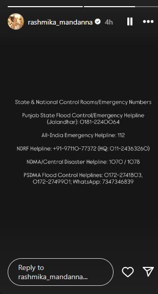 Mumbai, 3 September: Banjir yang menghancurkan di Punjab, Himachal Pradesh dan Jammu dan Kashmir telah meninggalkan negara dalam keadaan putus asa. Aktris Rashmika Mandanna hari ini, pada tanggal 4 September, mengambil akun media sosialnya untuk mengungkapkan kesedihannya dan juga berbagi nomor kontak penting jika terjadi keadaan darurat.