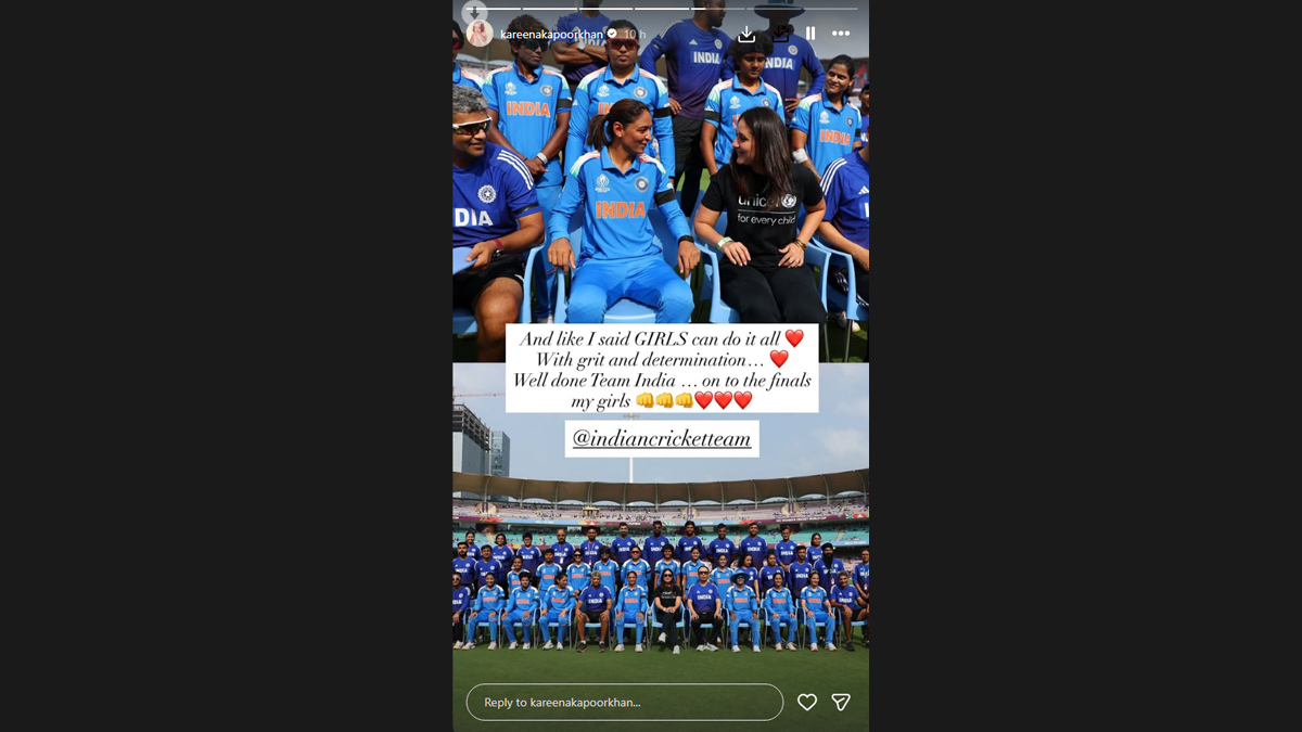 Kareena Kapoor berbagi di media sosial, “Dan seperti yang saya katakan, perempuan bisa melakukan semuanya. Dengan ketabahan dan tekad… Bagus sekali, Tim India… di final, gadis-gadisku.”