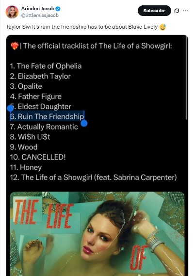 Album studio ke -12 Taylor Swift yang akan datang, “The Life of a Showgirl,” telah memicu gelombang teori penggemar dan spekulasi media, terutama di sekitar dugaan kejatuhan dengan teman lama dan aktris Hollywood Blake Lively. Di antara dua belas lagu yang diungkapkan dalam album ini adalah judul-judul yang sangat provokatif seperti “Ruin the Friendship” dan “Dibatalkan!”, Yang para penggemar percaya adalah trek diss yang ditujukan untuk Blake Lively di tengah pertarungan hukum aktris berusia 37 tahun yang sedang berlangsung dengan dia dengan dia dengan dia dengan aktris 37 tahun yang sedang berlangsung dengan dia dengan aktris 37 tahun dengan dia dengan dia 37 tahun dengan aktris yang sedang berlangsung dengan dia dengan aktris 37 tahun dengan dia dengan aktris 37 tahun dengan dia 37 tahun dengan aktris yang sedang berlangsung dengan dia 37 tahun dengan aktris yang sedang berlangsung dengan dia dengannya aktris 37 tahun dengan dia 37 tahun dengannya Itu berakhir dengan kami Lawan main dan sutradara Justin Baldoni. Fans dan orang dalam telah menarik hubungan antara judul lagu dan ketegangan antara Taylor Swift dan Blake Lively, menyoroti bahwa bintang pop belum secara terbuka mendukung Blake dalam perselisihan ini. 'The Life of a Showgirl': Taylor Swift mengumumkan album ke -12 di podcast Travis Kelce setelah penghitungan misterius (tonton video).
