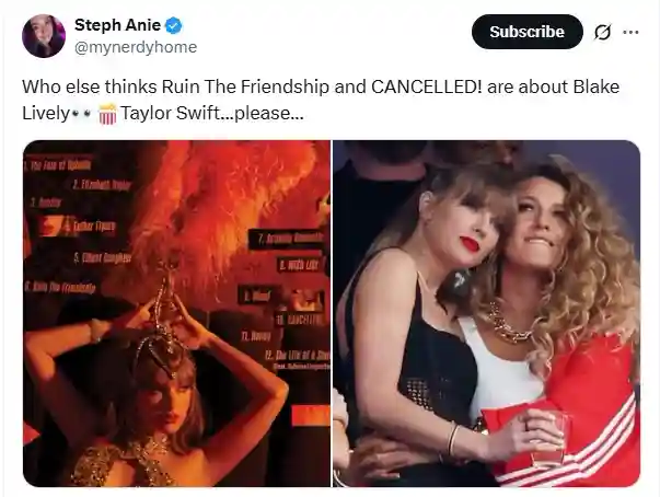 Jika “Ruin the Friendship” bukan tentang Blake, dan foto -foto ini tidak nyata. #Thelifeofashowgirl #Taylorswift pic.twitter.com/wtyaytzyrr
