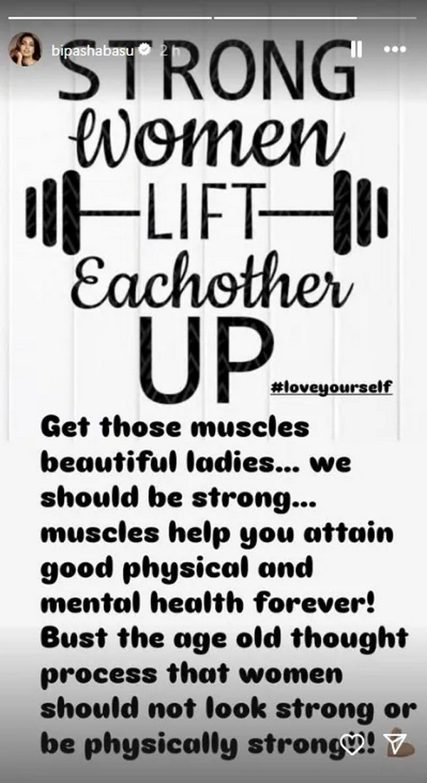 Bipasha Basu berbagi catatan tentang kisah -kisah Instagram -nya, yang seharusnya menjadi reaksi terhadap komentar Mrunal Thakur tentangnya. Bipasha berkata, “Wanita yang kuat saling mengangkat. #Loveyour sendiri. Dapatkan otot -otot itu wanita cantik … kita harus kuat … otot membantu Anda mendapatkan kesehatan fisik dan mental yang baik selamanya! Hancurkan proses pemikiran tua bahwa wanita tidak boleh terlihat kuat atau secara fisik kuat !!!” 'Toxic People Point Fingers': Bipasha Basu berbagi pos samar setelah tuduhan Mika Singh tentang perilaku tidak profesional pada set 'berbahaya' (lihat pic).